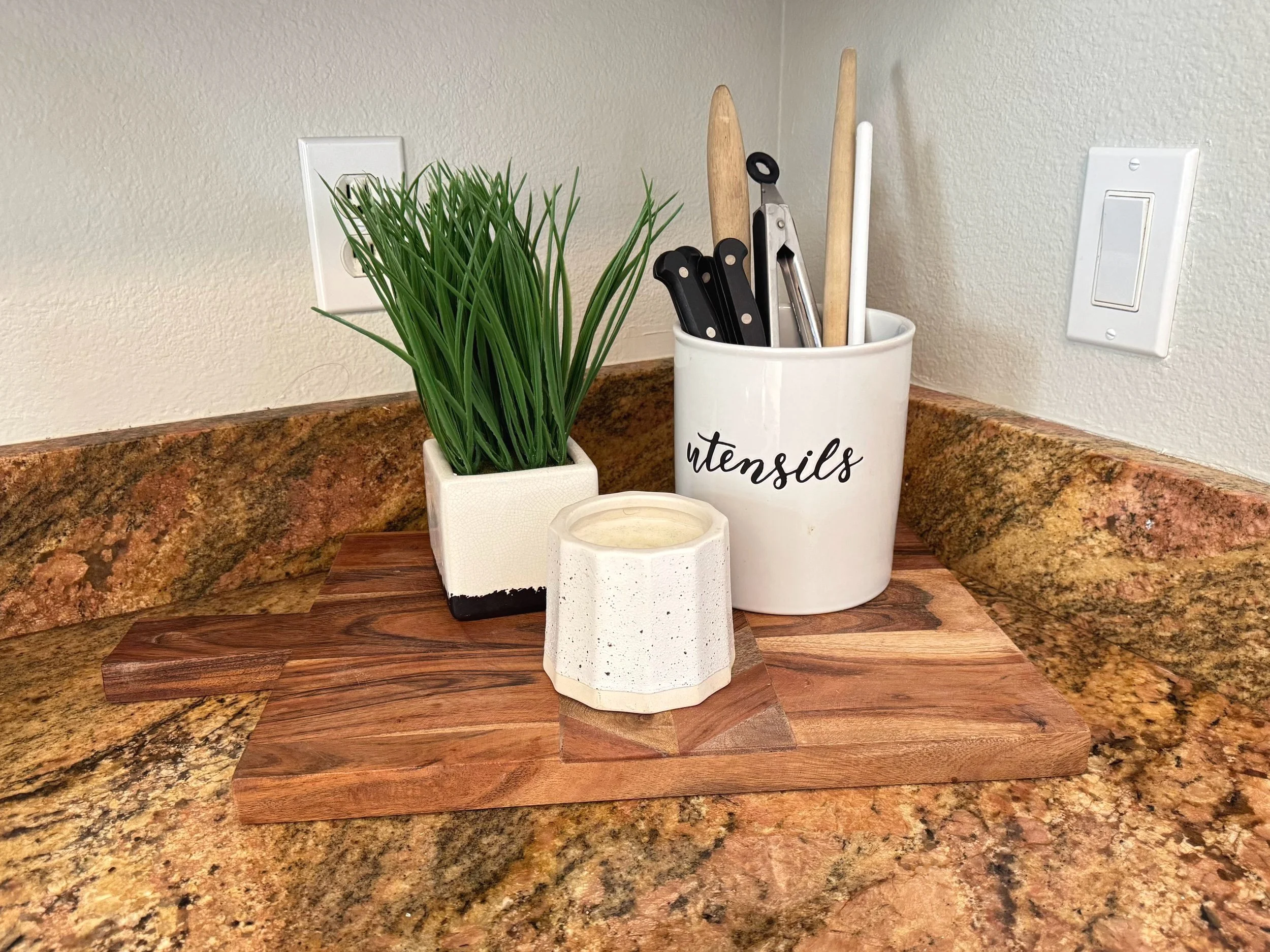 When I styled our counters, I realized a simple wooden cutting board could do more than just be functional. It became a base for layering. We used a cutting board as a base, then layered a small ceramic utensil jar on top of it. I threw in a small plant (my true weakness), a small candle, and the variety in material made it feel designed, not accidental.